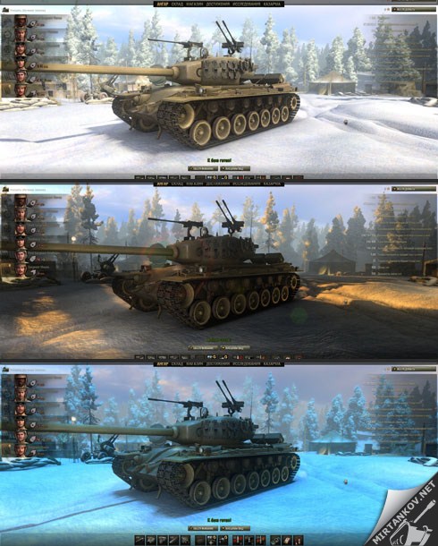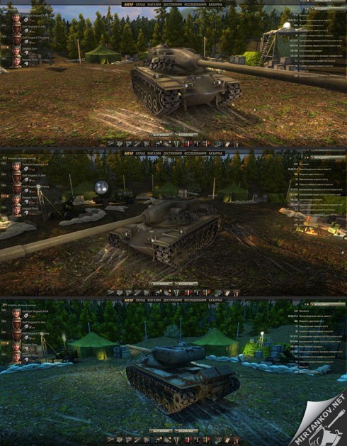 Зимний ангар для World of Tanks 0.8.2/0.8.3 изменен: убраны гирлянды, елка, пар возле фонарей, свет от прожекторов и из палаток, убраны салюты в небе. Основная версия ангара - всегда дневное освещение, дополнительные версии - смена дня и ночи, всегда ночь в ангаре (устанавливать сверху основы). СКАЧАТЬ